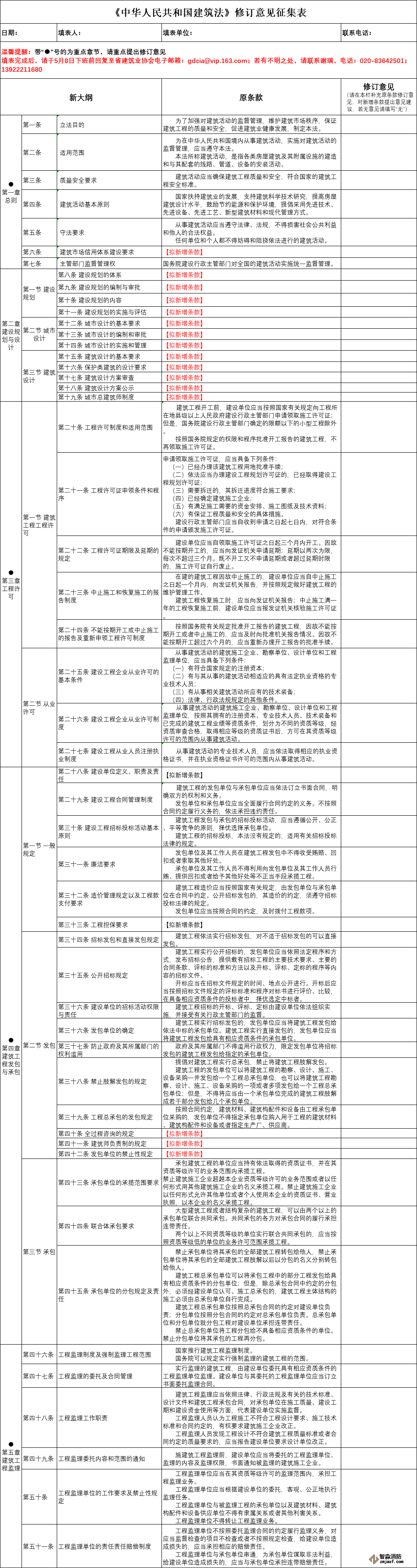 現(xiàn)將中國建筑業(yè)協(xié)會(huì)《關(guān)于征求對(duì)〈中華人民共和國建筑法〉修訂意見的函》(建協(xié)函〔2020〕17號(hào))轉(zhuǎn)發(fā)給你們,請(qǐng)根據(jù)文件要求組織相關(guān)人員,重點(diǎn)就《中華人民共和國建筑法》“總則”、“工程許可”、“建筑工程發(fā)包與承包”、“建筑工程監(jiān)理”、“建筑安全生產(chǎn)管理”、“建筑工程質(zhì)量管理”、“職業(yè)健康”、“法律責(zé)任”等八個(gè)章節(jié)提出修訂意見和建議,其他章節(jié)修訂意見亦可一并提出,將 《中華人民共和國建筑法》修訂意見征集表(附件2)于5月8日前發(fā)送至我協(xié)會(huì)郵箱,由我協(xié)會(huì)匯總后報(bào)送至中國建筑業(yè)協(xié)會(huì),感謝大力支持!