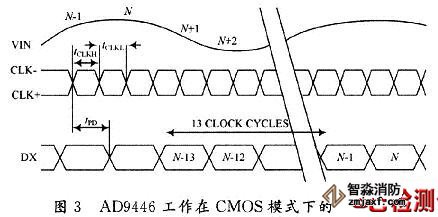 AD9446芯片的控制時序與傳統(tǒng)的低速A/D有所不同,它完全依靠時鐘來控制其采樣、轉換和數據輸出。AD9446通常在CLK第一個時鐘的上升沿開始采樣轉換,并在經過延遲tpd后,開始輸出數據。而數據則在第13個時鐘到來時才出現(xiàn)在D15~D0端口上。圖3是AD9446工作在CMOS模式下的時序圖。