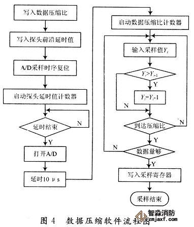 數據壓縮處理是對射頻信號高速采樣后進行前置處理的重要環(huán)節(jié)之一,需要在保持超聲回波信號基本特征前提下對采樣數據進行在線壓縮,而且要求壓縮后的數據與原始采樣信號的包絡相吻合。為此,在每次壓縮過程中,只取采樣所得的最大值,而舍棄其他采樣值。FPGA將計算所得采樣數據的壓縮比、探頭前沿延時計數值等數據送入相應的鎖存器,然后發(fā)出時序復位命令并發(fā)射,啟動探頭延時計數,延時到后啟動A/D采樣,同時壓縮比計數器開始計數,在時鐘信號的控制下,每采樣一次,壓縮比計數器減1,并將當前采樣值與前次采樣值比較,如大于則保存,否則舍棄,直至壓縮比計數到零后,得到一個有效的采樣數據。同時壓縮比計數器自動復位,重新開始計數,其工作流程如圖4所示。