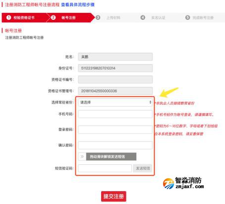 第五步:選擇常駐省份,先填寫(xiě)手機(jī)號(hào)碼,拖動(dòng)滑塊解鎖短信發(fā)送,點(diǎn)擊發(fā)送短信,填寫(xiě)驗(yàn)證碼和賬號(hào)密碼后進(jìn)行提交;