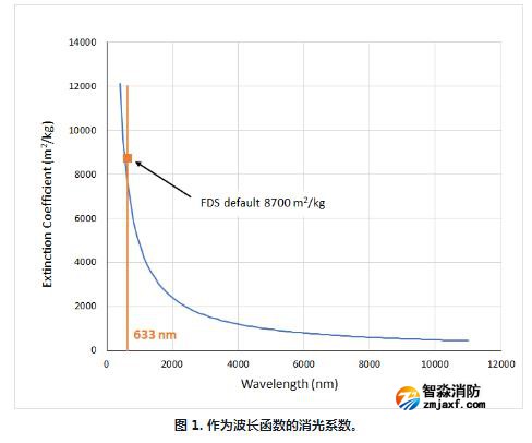 這繪制在圖1中。可見光譜從大約400nm(紫色)延伸到700nm(紅色)。評估波長-波長Wie633nm(用于獲得默認值的波長)處的質(zhì)量比消光相關(guān)性Km在FDS中給出的消光系數(shù)為,該系數(shù)小于FDS()中使用的默認值,但接近推薦的不確定性下限。7626m2/kg8700 m2/kg