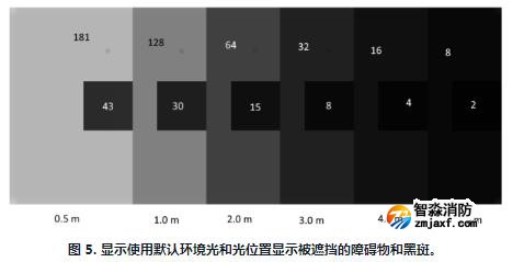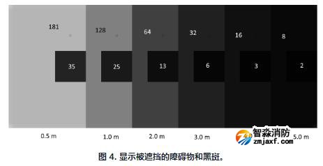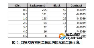 穆赫蘭指出,對于在白色背景下觀察的黑色物體,其值為C=-0.02通常用作定義可見性的對比度閾值。白色障礙物和黑色斑塊的預(yù)期光強度在圖3中給出,包括計算出的韋伯對比度。在這個問題中,背景和黑塊都被煙霧同等地遮擋,因此兩者的強度相同地降低并且計算出的韋伯對比度是恒定的。正如將要顯示,可見度隨著模糊度的增加而明顯降低,因此在這種情況下,Weber對比度似乎在計算可見度時沒有用。韋伯對比度的另一個問題是,對于純黑色物體(灰度為0),韋伯對比度方程將給出一個常數(shù)值-1.
