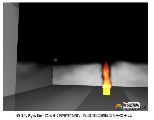 我們還可以與位于通風口外的相機拍攝的圖像進行直接比較。 圖 13顯示了 6 分鐘時的圖片。這可以與圖 14 中的 PyroSim 圖像進行比較,后者顯示的煙霧層稍低。我們還可以看到,在幫助照亮出口標志的實驗中包括了室內(nèi)照明。如煙層底部的紅色調(diào)所示,火也有助于照明。
