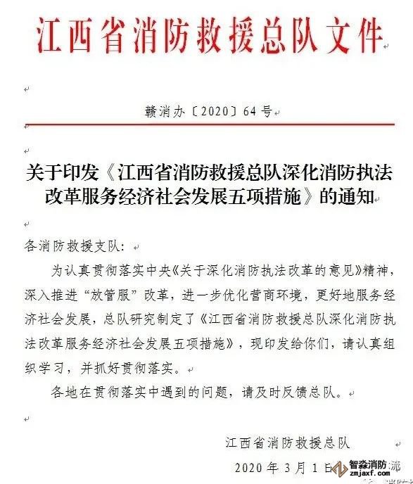 3、江西省消防救援總隊(duì)作為應(yīng)急管理部消防救援局確定的消防救援隊(duì)伍正規(guī)化建設(shè)試點(diǎn)單位,側(cè)重于執(zhí)法規(guī)范化建設(shè)試點(diǎn)。同時(shí),為全面落實(shí)省委省政府“確保疫情防控有力有效、經(jīng)濟(jì)恢復(fù)有序有力”的部署要求,更好地支持企業(yè)復(fù)工復(fù)產(chǎn)服務(wù)經(jīng)濟(jì)社會(huì)發(fā)展,決定試點(diǎn)推行告知承諾管理。