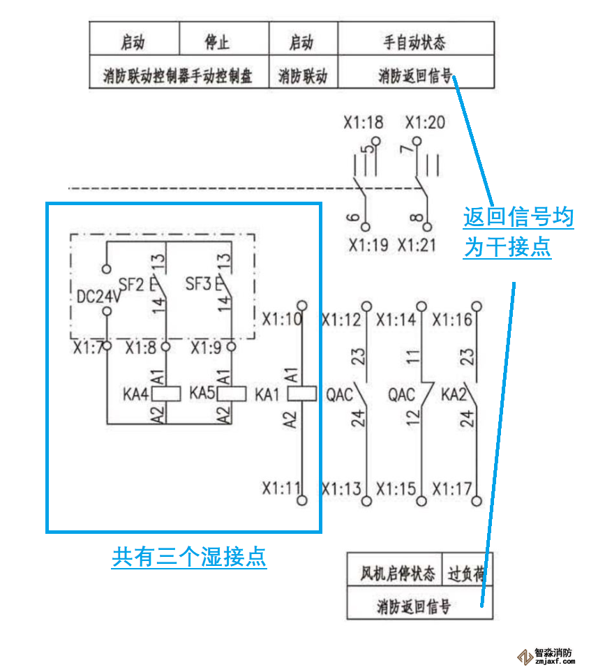 聯(lián)動觸發(fā)信號(自動啟動,總線) 和手動控制信號(手動啟、停,專線),兩種信號均為DC24V有源觸點(diǎn),消防信號中間繼電器設(shè)于消防水泵控制箱內(nèi),滿足GB50116-2013第4.1.1條,4.1.3條。