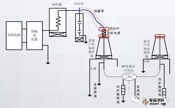 變頻諧振系統(tǒng)輸出的電源不能直接作為電纜局放試驗的電源直接施加于被試對象進行局部放電測試,必須采取有效措施對試驗電源進行預處理,通過設置串聯(lián)電抗、防暈導線、均壓環(huán)進行對試驗電源質量進行改善,其電氣原理所下圖所示。