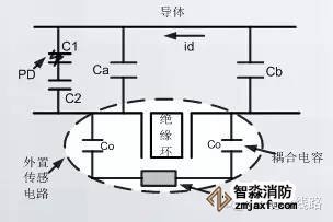 在電纜的中間接頭,測試原理如圖所示,一側電纜的鎧裝與電纜導體之間存在電容Ca,另一側電纜的導體與鎧裝之間存在電容Cb,如果在電纜的中間接頭發(fā)生局部放電,那么形成兩個電容C1和C2,此時Ca和Cb就會通過導體向C1和C2充放電,從而形成局放電流回路,在兩側電纜屏蔽層橋接一個高頻低阻的電容臂C0和高頻電流傳感器,就可以檢測到局放的脈沖電流信號。