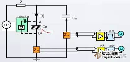 在被試驗電纜Cx注入標準局放信號Qo以模擬被試對象發(fā)生了局部放電,當標準局放信號注入時,檢測阻抗Zm1、Zm2輸出信號,測試系統(tǒng)M獲取局放信號的幅值大小、相位分布特征、頻譜特性等信息。